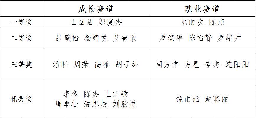 评委们根据选手们的现场陈述进行了提问,并结合选手们的职业目标设定是否合理、行动计划是否可行等进行了综合评分,现场两个赛道分别产生一等奖2名,二等奖3名,三等奖4名。