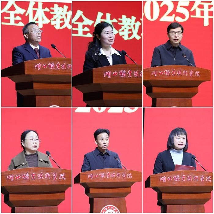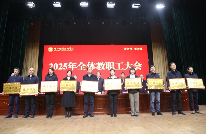 郭国文指出,2025年,是“十四五”规划收官之年,是新一轮“双高计划”开启之年,是学校创建职业本科学校全面推进之年。要坚持以习近平新时代中国特色社会主义思想为指导,全面贯彻落实党的二十大、二十届三中全会和全国全省教育大会精神,深入贯彻习近平总书记考察湖北重要讲话精神,以高质量发展为主题,以立德树人为根本,以创高升本为引领,以改革创新为动力,以强校有我为抓手,砥砺奋进、开拓进取,奋力推动学校发展开创新局面、谱写新篇章。一是要全面推进人才培养体系改革、创新开展“五金新基建”建设、加快教育教学数智化转型、持续深化“岗课赛证”综合育人、着力夯实教学管理工作基座,在提高教育教学水平上开创新局面;二是要加强学生思想政治教育、提升“一站式”学生社区育人质效、引导促进学生全面发展、推进高质量充分就业、建设更高水平学工队伍,在创新学生管理服务上开创新局面;三是要打造高水平教师队伍、推动科研工作提质增效、深化社会服务比拼跃升、持续夯实学校办学基础,在提升办学综合能力上开创新局面;四是要高标准建设市域产教联合体、深入推进产教融合校企合作、积极开展国际交流合作、引领市域内职业教育协同发展,在推进开放办学上开创新局面;五是要持续深化动能激发、着力提升治理效能、奋力推进“创高升本”,在打造标志性成果上开创新局面。