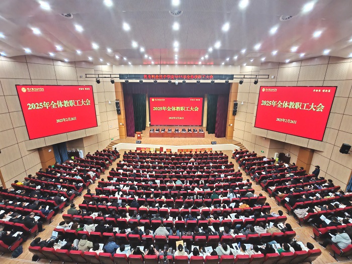 (本网讯 陈灏 唐熙隆)乘“巳”而上开新局,奋楫笃行谱新篇。2月26日下午,全体教职工大会在南校区崇德礼堂召开。会议深入学习贯彻党的二十大、二十届三中全会和全国全省教育大会精神,贯彻落实2025年全国全省教育工作会议要求,总结学校2024年工作,安排部署2025年任务,组织动员全校上下锚定目标、昂扬奋进,推动学校发展开创新局面、谱写新篇章。全体校领导出席会议,党委副书记、校长郭沙主持会议,党委书记郭国文发表讲话。
