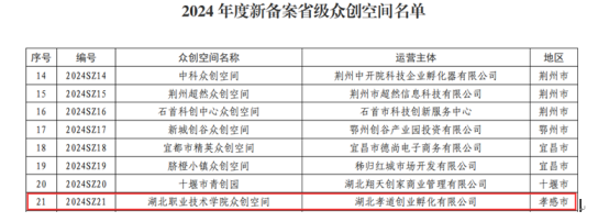 (本网讯 艾欢 黄灿)2月24日,湖北省科技厅公布了《关于公布2024年度新认定省级科技企业孵化器和新备案省级众创空间的通知》,我校创业孵化基地经组织申报、市科技局审核推荐、省科技厅实地核查等环节,成功备案省级众创空间。这是学校继2023年备案市级众创空间、2024年获批省级创业孵化示范基地后,在创新创业平台建设上取得的又一新突破。