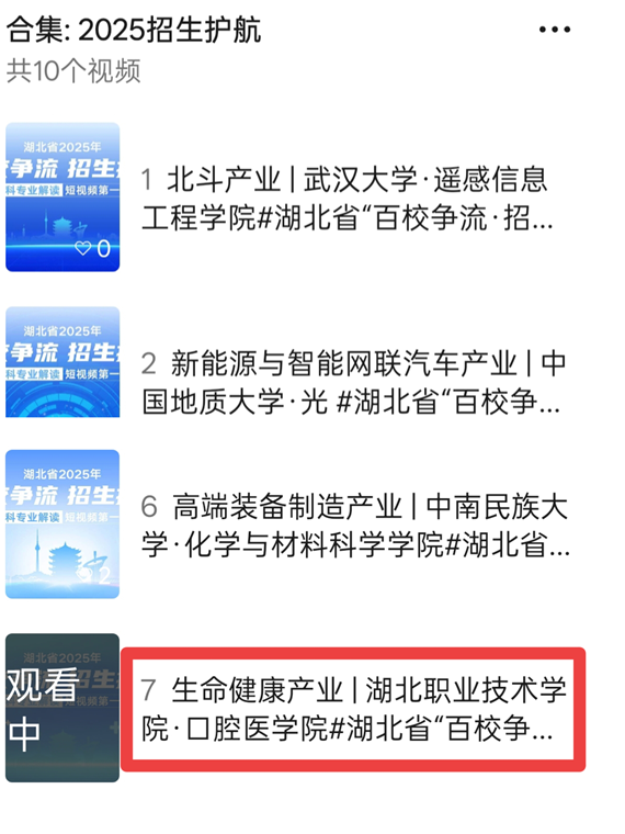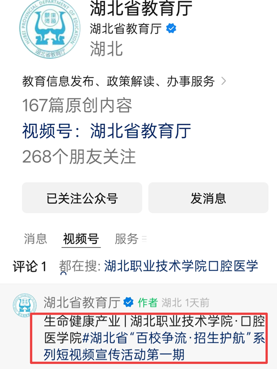 (本网讯 张玮 陈灏 柯豆豆)近日,我校口腔医学院精心制作的招生宣传视频登上湖北省教育厅视频号平台进行宣传。这一成果不仅是对该院办学实力的高度认可,更是该院在职业教育领域影响力持续提升的标志之一。