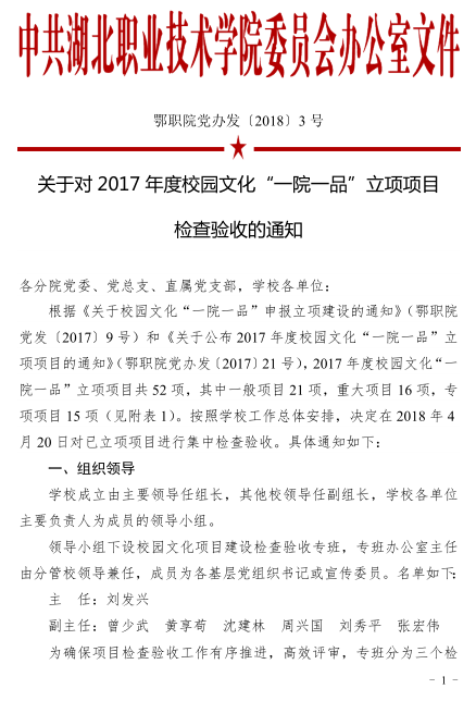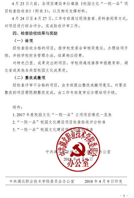 关于对2017年度校园文化“一院一品”立项项目检查验收的通知