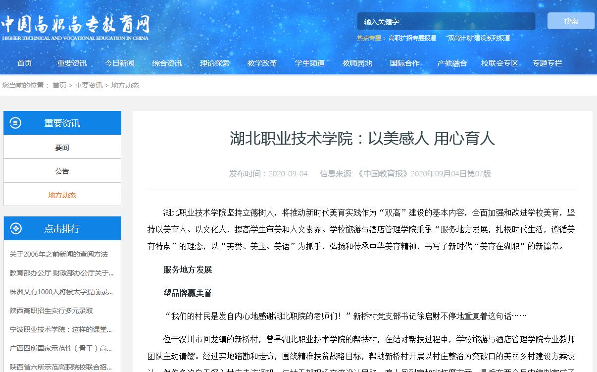 易游官网平台坚持立德树人,将推动新时代美育实践作为“双高”建设的基本内容,全面加强和改进学校美育,坚持以美育人、以文化人,提高学生审美和人文素养。学校旅游与酒店管理学院秉承“服务地方发展,扎根时代生活,遵循美育特点”的理念,以“美誉、美玉、美语”为抓手,弘扬和传承中华美育精神,书写了新时代“美育在湖职”的新篇章。