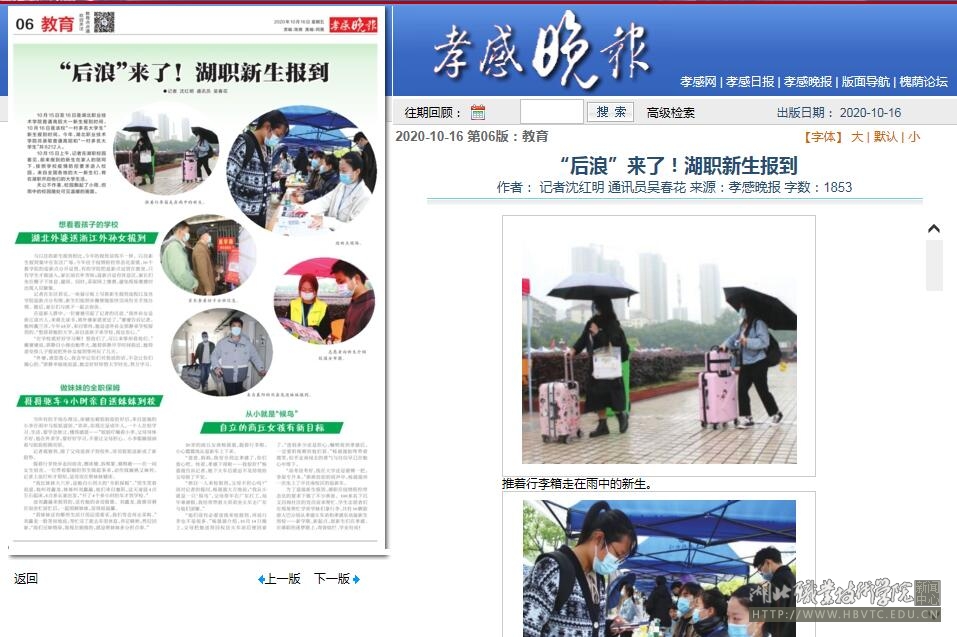 10月15日上午,记者在湖职校园看见,前来报到的新生在家人的陪同下,按照学校疫情防控要求进入校园。来自全国各地的大一新生们,将在湖职开启他们的大学生活。