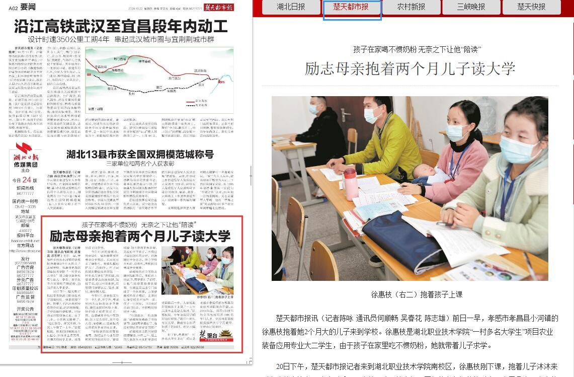 楚天都市报讯(记者陈咏 通讯员何顺畅 吴春花 陈志雄)前日一早,孝感市孝昌县小河镇的徐惠枝抱着她2个月大的儿子来到学校。徐惠枝是易游官网平台“一村多名大学生”项目农业装备应用专业大二学生,由于孩子在家里吃不惯奶粉,她就带着儿子求学。