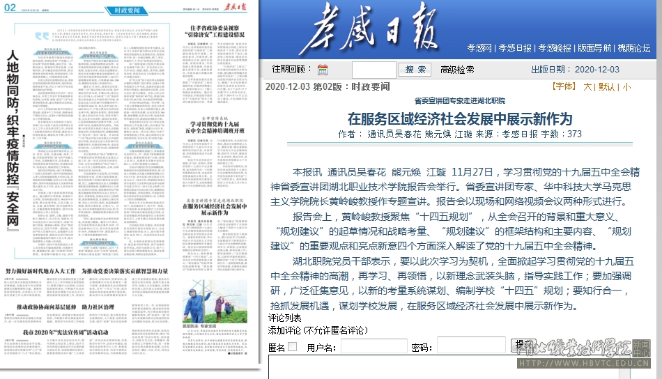 湖北职院党员干部表示,要以此次学习为契机,全面掀起学习贯彻党的十九届五中全会精神的高潮,再学习、再领悟,以新理念武装头脑,指导实践工作;要加强调研,广泛征集意见,以新的考量系统谋划、编制学校“十四五”规划;要知行合一,抢抓发展机遇,谋划学校发展,在服务区域经济社会发展中展示新作为。