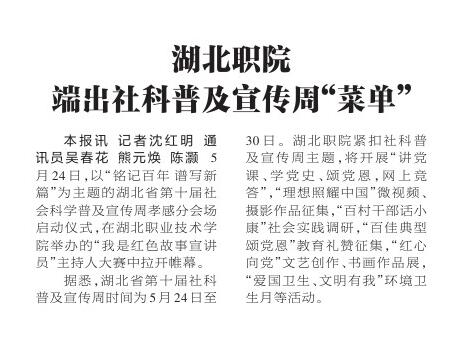 据悉,湖北省第十届社科普宣传周时间为5月24日至30日。湖北职院紧扣社科普宣传周主题,将开展“讲党课、学党史、颂党恩,网上竞答”,“理想照耀中国”微视频、摄影作品征集,“百村干部话小康”社会实践调研,“百佳典型颂党恩”教育礼赞征集,“红心向党”文艺创作、书画作品展,“爱国卫生、文明有我”环境卫生月等活动。