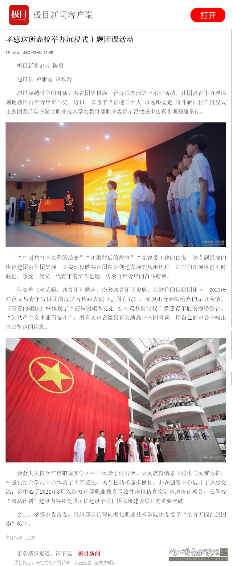 通过穿越时空的对话、共青团史料展、音诗画表演等一系列活动,让团员青年直观深刻地感悟百年青年奋斗史,近日,孝感市“喜迎二十大 永远跟党走 奋斗新征程”沉浸式主题团课活动在易游官网平台教育部职业教育示范性虚拟仿真实训基地举行。